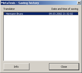 The Saving history dialog box displays the saving history of the current TU, that is, the history of new translations saved in the TM.