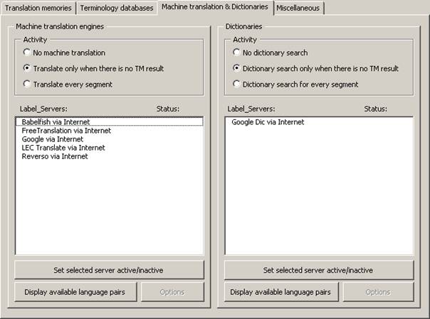 The machine translation engines are set up via the tab Machine translation: