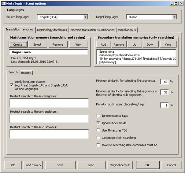 The main setting is visible in the upper margin of the dialog: source and target language. This setting is mandatory and has to be made first because it partly influences the available options (especially machine translation engines).