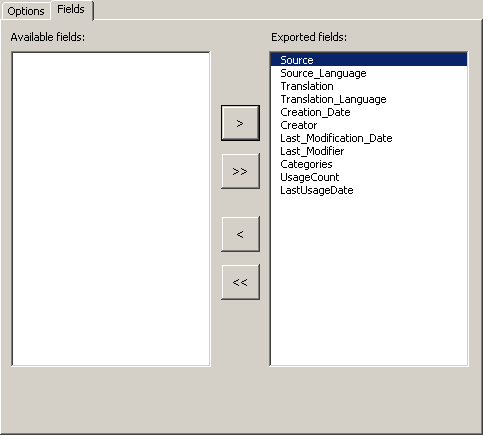 The Fields tab is only visible for other formats than TMX, and it consists of two list boxes: Available fields and Exported fields plus four buttons in the middle.